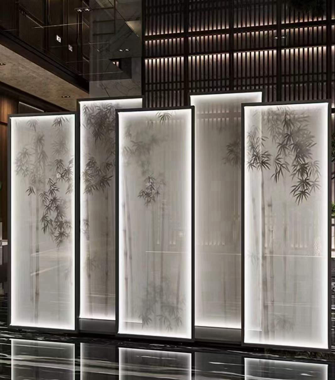 夾絲水墨畫玻璃是近年新流行的高端夾絲玻璃,采用超白鋼化玻璃加上設計印刷后的絹絲和EVA膠片通過專業(yè)設備熱壓融合在一起,因夾絲夾膠玻璃安全,破碎不傷人的特性,在裝飾行業(yè)大受歡迎,本公司生產夾絲玻璃有多年的行業(yè)經驗,有專業(yè)的設計安裝團隊,可根據(jù)客戶需要設計各種圖案,客戶也可以來圖定制夾絲玻璃。
