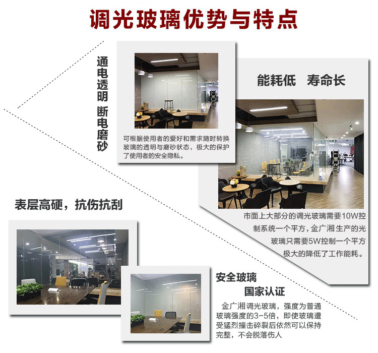 產(chǎn)品定義調(diào)光玻璃是一款將液晶膜復(fù)合進(jìn)兩層玻璃中間,經(jīng)高溫高壓膠合后一體成型的夾層結(jié)構(gòu)的新型特種光電玻璃產(chǎn)品。使用者通過(guò)控制電流的通斷與否控制玻璃的透明與不透明狀態(tài)。玻璃本身不僅具有一切安全玻璃的特性,同時(shí)又具備控制玻璃透明與否的隱私保護(hù)功能,由于液晶膜夾層的特性,調(diào)光玻璃還可以作為投影屏幕使用,替代普通幕布,在玻璃上呈現(xiàn)高清畫(huà)面圖像。
